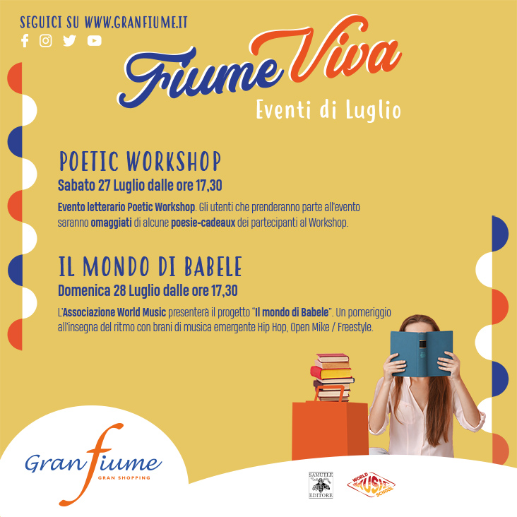 Sabato 27 Luglio, dalle ore 17:30, presso l’Area Libro “Fiumeviva” del Centro Commerciale Gran Shopping Granfiume si terrà l’evento letterario Poetic Workshop: gli scrittori Maria Milena Priviero, Roberto Rocchi, Fausto Maiorana, Valentina Premerl, Elisabetta Salvador, Giorgia Vecchies, Giancarlo Morinelli, Mina Campaner, Fawad Raufi, Stefania Pozzobon leggeranno versi tratti dalle proprie opere, nonché testi di poeti amati.